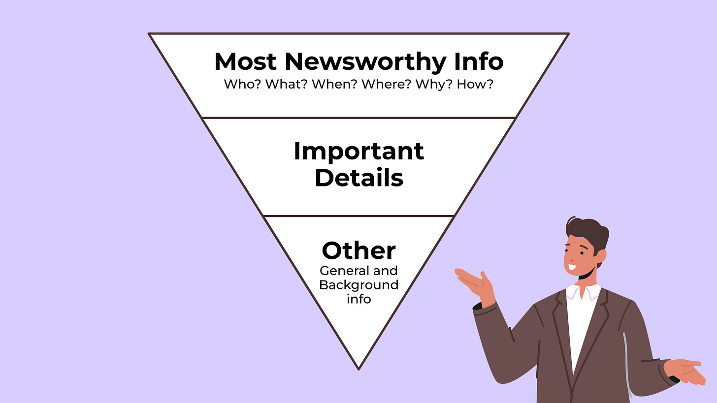 Before you begin writing your press release, think about the most compelling and pertinent messages you want your audience to know right away. This is called the inverted pyramid style, a way of writing where the most important information comes first, followed by supporting details and background, so readers, journalists, search engines, and AI tools get the key points right away.